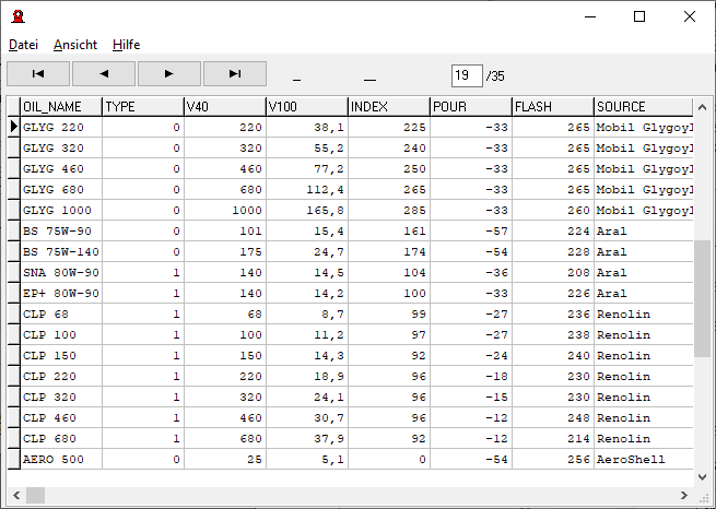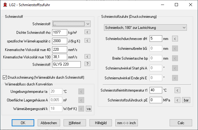 Bislang musste man den Schmierstoff zwischen ISO VG2 und ISO VG 1500 wählen. Jetzt kann man auch einen Schmierstoff aus der Datenbank lubri.dbf wählen, oder einen anderen Schmierstoff eingeben bei Angabe der kinematischen Viskosität bei 40°C und bei 100°C.