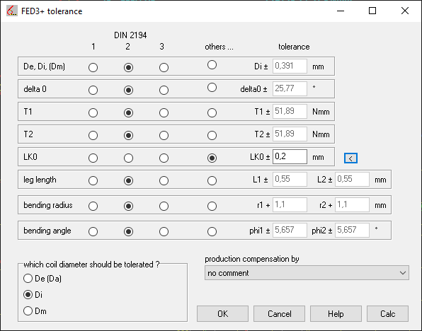 In FED3+, the tolerance according to DIN 2194 for torsion springs with coil spacing is calculated for the spring body length LK0. There is no statement in DIN about the tolerance for torsion springs without a coil spacing, in FED3 + the specified formula is also used for a = 0. However, if the coil ratio Dm/d becomes greater than 10, the tolerance increases exponentially. At Dm/d> 20, the tolerance of LK0 is greater than LK0 itself. If you want to output LK0 without tolerance, go to "Other .." under "Edit\Tolerance" and enter 0. New for FED3 + is now a suggestion button "<". If a = 0 (without coil spacing), a tolerance for LK0 is suggested according to the formula: