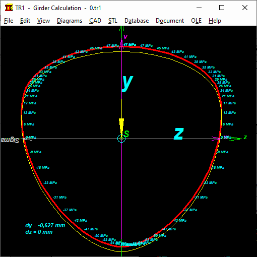 Under "View \ Profile with stress and bending", the bending stress at each point of the profile is displayed, as well as the deflection at the specified x-coordinate (yellow contour).