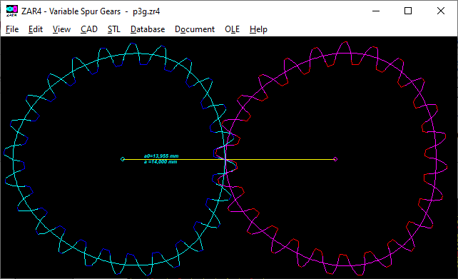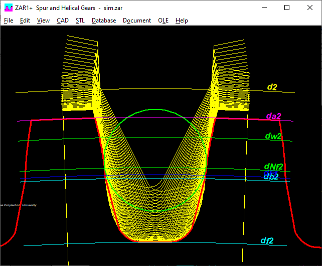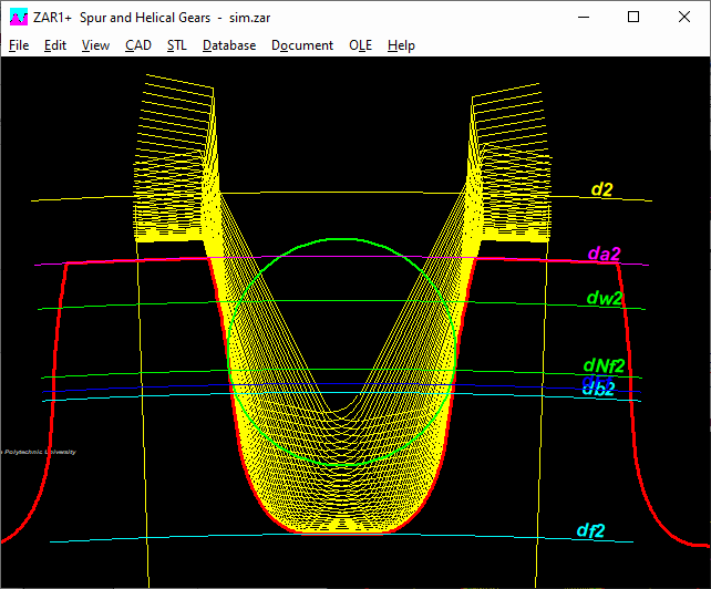For very strongly undercut gears (e.g. alfa = 15 ° and x = -1.3), the root rounding trochoid at the transition to the involute was not drawn cleanly. In this unusual gear, the pitch circle diameter is outside the toothing, and the undercut area with the fillet is larger than the involute. Such gears are now also drawn continuously if the starting angle of the root fillet is enlarged (+2pi instead of +0pi) under "CAD \ Settings \ Draw tooth root curve ?".
