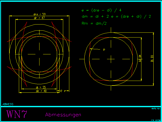 Für den (theoretischen) Außendurchmesser des durchgehenden Trochoidenprofils wird in WN7 die Bezeichnung "dre" eingeführt und mit ausgedruckt. In DIN 32712 gibt es schon einen ähnlichen Wert "dr" als mittleren Durchmesser für die Berechnung der Flächenpressung: