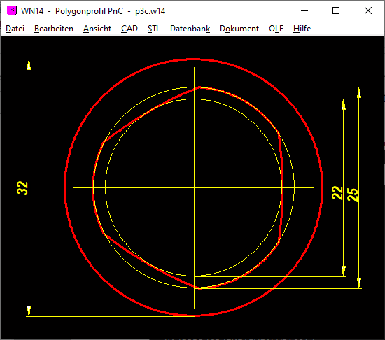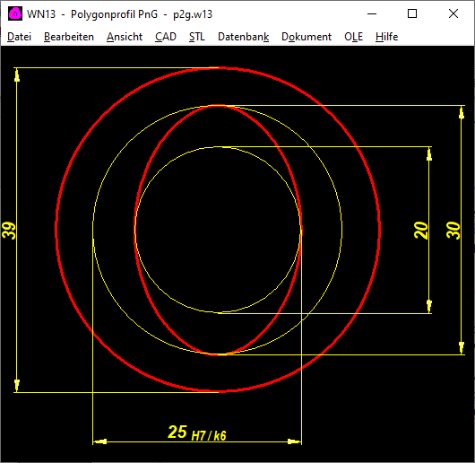 Ein Polygon-Trochoid mit 2 Ecken ergibt eine Ellipse. Mit 3 Ecken ein P3G Profil. Mit 4 Ecken ergibt sich eine P4C Kontur, aber ohne Begrenzung durch Kreisbogen. Eine richtige P4C-Kontur kann man aber auch in GEO1+ laden: in WN7 unter "Datei\Export DXF" bzw. "CAD\P4C" speichern, dann in GEO1+ unter "Datei\Import DXF" laden. In GEO1+ werden Fläche und Flächenmomente aus der Summe der Koordinaten berechnet. Ein Vergleich eines in GEO1+ generierten P3G Profils mit berechneten Daten aus WN6 ergibt eine gute Übereinstimmung bei Querschnittsfläche A und Flächenmomenten Ip und Ix. Der Schwerpunkt liegt genau im Nullpunkt. Das Widerstandsmoment Wmin ist I/rmax mit rmax=d2/2. Bei Wx=Ix/d2/2 gibt es eine gute Übereinstimmung, bei Wp=Ip/d2/2 gibt es eine Abweichung von ca. 10% mit Wp aus DIN 32711.