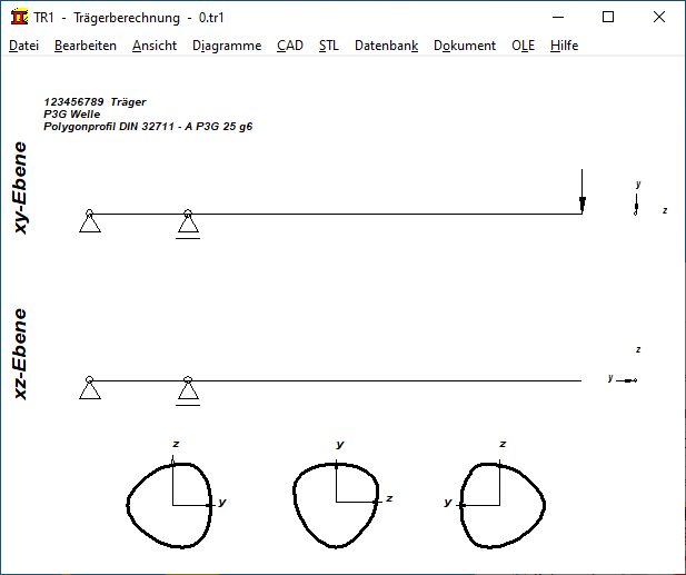 In die Profil-Datenbank zur Trägerberechnung wurde die Polygontrochoidwelle aufgenommen. Damit können Wellen mit P3G-Profil als Träger berechnet werden. Allerdings nur auf Zug/Druck und Biegung, nicht auf Torsion. Die Anzahl der Ecken kann eingegeben werden. Bei 2 Ecken gibt es eine Ellipse. Je mehr Ecken, desto kleiner muss die Exzentrizität sein. Sonst gibt es den bei P4C-Profilen bekannten Effekt, das nutzbare Profil mittels Kreisbogen zu begrenzen.