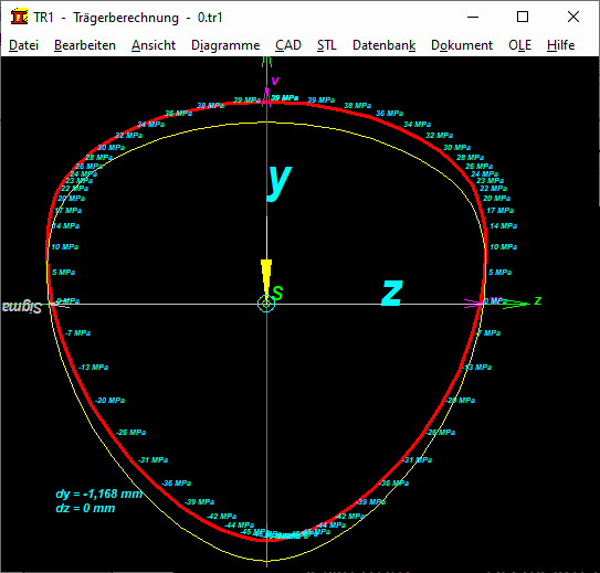 Unter "Ansicht \ Profil mit Spannung und Biegung" wird die Biegespannung in jedem Punkt des Profils angezeigt, außerdem die Durchbiegung an der angegebenen x-Koordinate (gelbe Kontur).