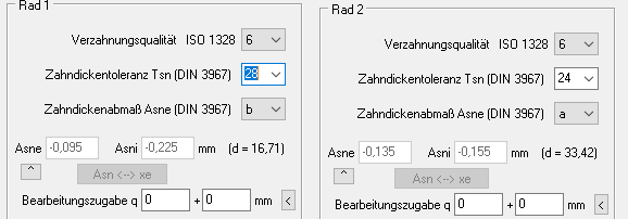 Wegen der größeren Toleranzen bei 3D-Druck von Zahnrädern aus PLA oder ABS muss das Flankenspiel vergrößert werden, so dass die Modellzahnräder auch laufen. Unter "Bearbeiten\Qualität" wählen Sie ein Toleranzfeld für großes Flankenspiel, z.B. b 28 für Zahnräder aus PLA oder ABS. Keine Bearbeitungszugabe (0).