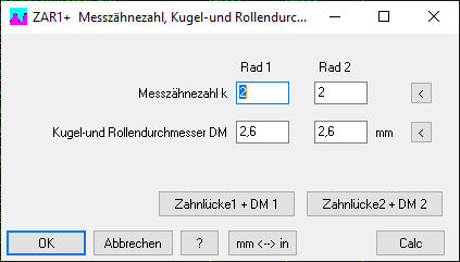 Die Vorschlagswerte mit "<" Button wurden aus dem Profilverschiebungsfaktor xemin berechnet, überprüft wurden die Eingabewerte dagegen mit Toleranzmitte (xemin+xemax)/2. Bei großen Zahnflankentoleranzen ergeben die Vorschlagswerte für den Größtwert von xe andere Meßzähnezahlen und Kugeldurchmesser als für den Kleinstwert mit mehr als 30% Unterschied. Für einige Grenzfälle ergab sich deshalb der kuriose Fall, dass eine Warnung "k measure !" angezeigt wurde, obwohl der Vorschlagswert verwendet wurde. Jetzt wird für alle Vorschlagswerte der aus den Zahndickenabmaßen berechnete mittlere Profilverschiebungsfaktor verwendet. Für den Hinweis danke ich Jong-Gak Kim von Pion.