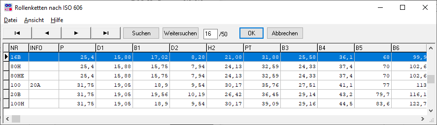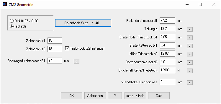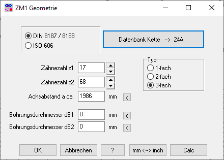 Umfangreiche Änderungen gab es bei der ZM1-Software zur Berechnung von Rollenketten und Kettenrädern. Die Software ZM1 für Kettentriebe wurde an die ISO 606:2018 angepasst. Die ISO 606 ersetzt die alten DIN-Normen 8186, 8187, 8196. Die Kettengrößen sind teils identisch mit DIN 8187/8188, teils unterscheiden sie sich. Manche Kettengrößen aus der DIN wurden unter anderer Bezeichnung in ISO 606 übernommen. Beispiel: aus "08A" wird "40" und aus "085" wird "41". Es gibt jetzt eine neue Datenbank ISO606.DBF mit Kettenabmessungen nach ISO 606. Diese enthält 100 Datensätze, enthalten sind auch die verstärkte Ausführung "H" und die extra verstärkte Ausführung "HE". Die alte Datenbank mit DIN-Ketten ist zusätzlich verfügbar, dass auch alte Berechnungsdateien weiterhin fehlerfrei geöffnet werden. Bei Auswahl der Kettengröße ist sowohl die alte als auch die neue Datenbank verfügbar. Um alte Berechnungen auf die neuen ISO-Bezeichnungen umzustellen, öffnet man die Berechnungsdatei, dann einfach unter Bearbeiten\Abmessungen die entsprechende Kettengröße aus der ISO606-Datenbank wählen, Berechnungsergebnisse vergleichen und speichern.