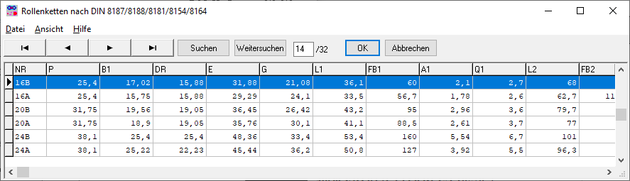 Die Datenbankfelder der beiden Datenbanken sind unterschiedlich, weil auch die zugrunde gelegten Tabellen unterschiedlich sind. In der alten DIN Datenbank gibt es die Felder A1, A2, A3 für die Gelenkfläche AG für 1-fach, 2-fach, 3-fach Ketten. Daraus wird die Flächenpressung berechnet p=F/AG.