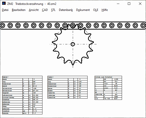 Demnächst gibt es ein neues Programm zur Berechnung von Triebstoffverzahnungen. Als Antriebsrad wird ein Kettenrad verwendet ähnlich wie in ZM1. Früher wurden Triebstöcke oft verwendet, weil ein Triebstock einfacher herzustellen war als eine Zahnstange. Wenn man heutzutage eine schnelle und günstige Lösung für einen Lineartrieb will, kauft man als Triebstock eine handelsübliche Kette und spannt diese linear ein.