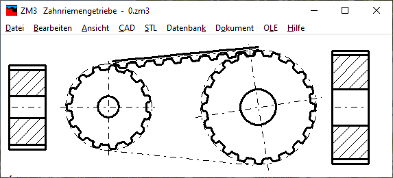 ZM3 generiert auch ein Bild vom Zahneingriff Zahnriemen mit Riemenscheibe. Beim T-Profil fällt auf, dass das Flankenspiel sehr groß ist. Für Antriebe mit Drehrichtungsumkehr ist das T-Profil so nicht zu gebrauchen, außer man verändert das Zahnprofil der Riemenscheiben.