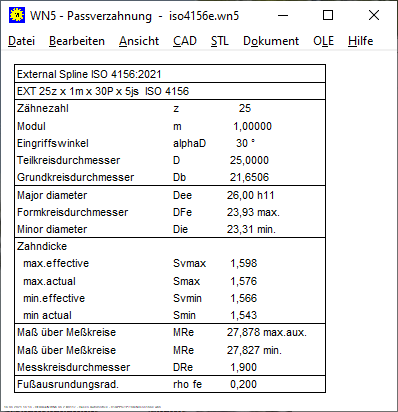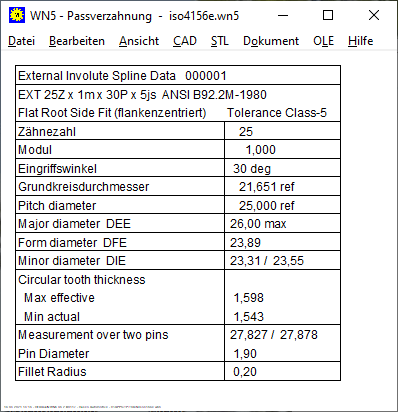 Neu in WN5 V5.1 war eine Quick4-Ansicht im A3-Zeichnungsrahmen. Unglücklicherweise war seit dieser Änderung in der Fertigungszeichnung die Tabelle nach ANSI B92.2M angezeigt worden, obwohl ISO 4156 gewählt war. Und dabei wurde auch noch das Größtmaß der Zahndicke "Max effective" der Zahnwelle immer für H/h angezeigt, auch wenn H/d, H/e, H/f gewählt war. In der Quick3 und Quick4-Ansicht wurde dagegen die richtige Tabelle angezeigt. Betroffene Kunden mit WN5 V5.1 erhalten ein kostenloses Update, sie wurden bereits informiert.