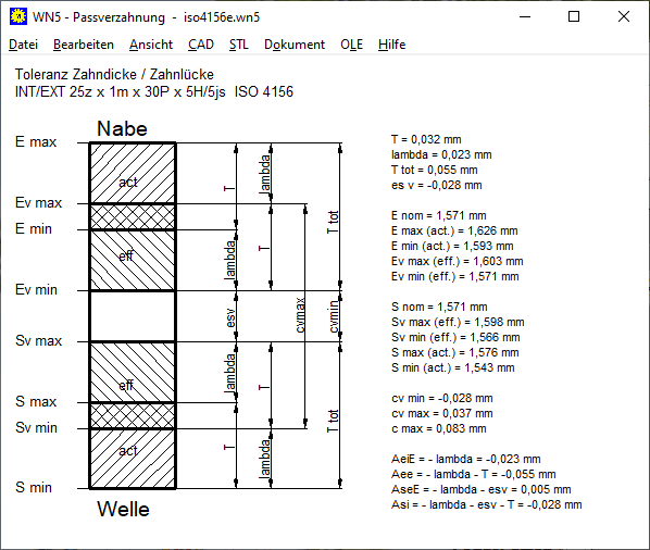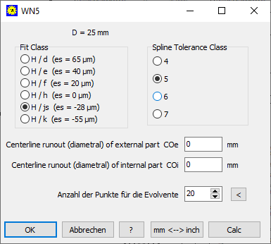 In der neuesten ISO 4156:2021 (auch schon in ISO 4156:2005) gibt es außer den Spielpassungen H/d, H/e, H/f und H/h zusätzlich die Übergangspassungen H7/js und H/k für festen Sitz, in WN5 seit V4.9. Dabei gelten bei der Berechnung der Abmaße von "js" und "k" für esv (fundamental deviation) nicht die ISO-Abmaße nach Passungstabelle, sondern die Klauseln "esv = (T+lambda)/2" für "js" und "esv = (T+lambda)" für "k". In der letzten Version 5.1 von WN5 waren die Abmaße nach ISO 286 verwendet worden. Damit werden die Paarungen H/js und H/k jetzt deutlich straffer.