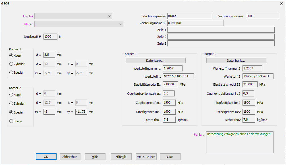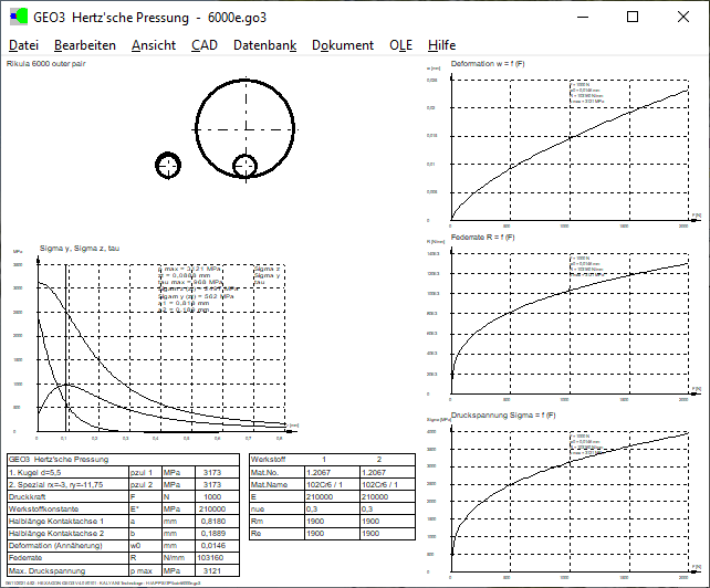 Wenn die Hertzsche Pressung zwischen Kugeln oder Zylindern ermittelt werden soll, berechnet GEO3 jetzt auch die Stauchung der Körper, außerdem die Gesamt-Federrate unter Berücksichtigung der Stauchung von Kugel oder Zylinder.
