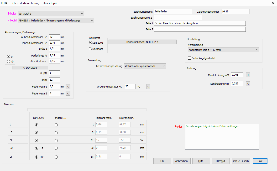 In der Quick-Eingabe sind alle Eingabefenster zur Tellerfederberechnung zu einem großen Fenster zusammengefasst, im Hintergrund kann man alle möglichen Grafikfenster mit Berechnungsergebnissen und Diagrammen anzeigen lassen.