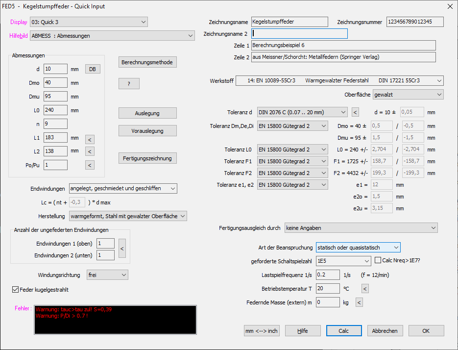 In der Quick3-Ansicht werden alle Daten am Grafikbildschirm angezeigt, mit Skizze und Diagrammen von Deformation, Pressung, Federrate, Spannungsspektrum an der Oberfläche.