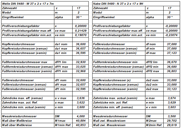 Ergänzend zu "Tabellen DIN 5480:1991" und "Tabelle DIN 5480:2006" gibt es jetzt noch "Tabelle Verzahnung". Der Unterschied zu den DIN 5480-Tabellen ist, daß für Kopf- und Fußkreisdurchmesser nicht allgemein festgelegte Abmaße gelten, sondern die individuell berechneten Größt- und Kleinstmaße von Kopf- und Fußkreisdurchmesser bei Flankenzentrierung aus Zahndickenabmaßen und Zahnhöhenfaktoren. Die Profilverschiebungsfaktoren x, xemax, xemin (nom/max/min) werden mit ausgegeben.
