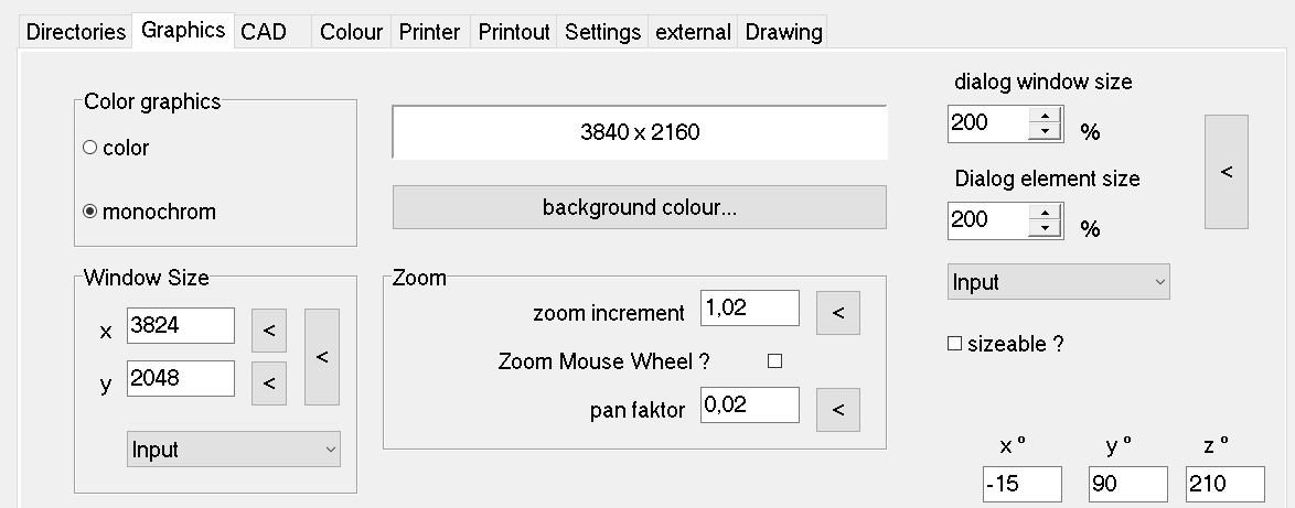 In Windows 10 you can change the display under "Settings \ System \ Display \ Scaling" in steps of 100%, 125%, 150%, 200%. However, this also reduces the graphics resolution. Alternatively, you can change the size in HEXAGON software without changing the Windows system settings. To do this, increase the size of the dialog window and dialog element size under "File\Settings\Graphics". Also check whether the large Quick Input window still fits into your screen when the window size is changed. Otherwise "sizeable?" tick for scroll bar in all input windows.
