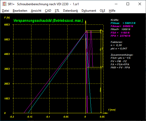 Eine symbolische Darstellung einer Sinuskurve wird übrigens nur eingezeichnet, wenn FAu=0 ist. Weil in den Verspannungsschaubildern FAu nicht berücksichtigt wird. Ausnahme: FAo und FAu sind beide kleiner als 0 (Druckbeanspruchung), dann werden FSA und FPA negativ. Ansonsten wird FAu nur für die Berechnung der Spannungsamplitude sigmaA verwendet. Im Montagezustand ist FAu=0 und FAo=0.