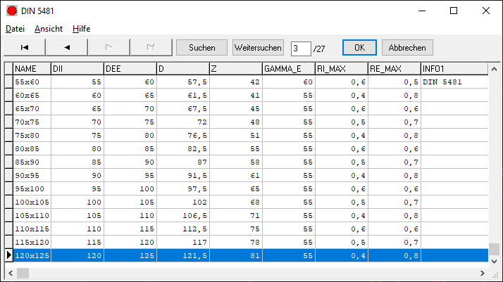 DIN 5481 für Kerbverzahnungen umfasst die Größen 7x8 bis 55x60. In der WN8-Datenbank gibt es darüberhinaus 60x65 bis 120x125. Für diese nicht-standardisierten Größen wurden sinnvolle Fußausrundungsradien festgelegt (RI_MAX und RE_MAX).