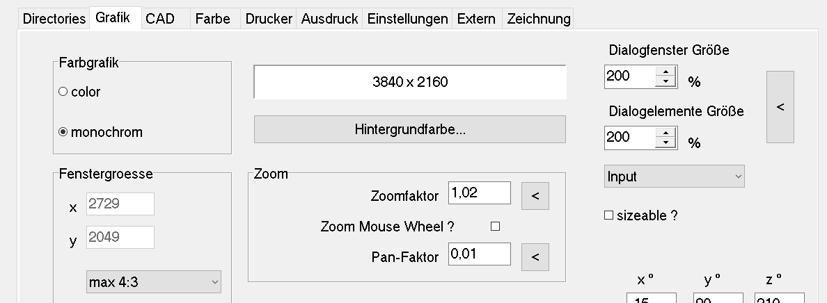 In Windows 10 kann man die Anzeige verändern unter "Einstellungen\System\Anzeige\Skalierung" oder "Einstellungen\Erleichterte Bedienung" in Stufen 100%, 125%, 150%, 200%. Damit wird aber auch die Grafikauflösung reduziert. Alternativ können Sie die Größe in HEXAGON-Software ändern, ohne die Windows-Systemeinstellungen zu ändern. Dafür vergrößern Sie unter "Datei\Einstellungen\Grafik" Dialogfenstergröße und Dialogelementegröße. Prüfen Sie auch, ob bei einer Schriftgrößenänderung das große Fenster mit der Quick-Eingabe noch in Ihren Bildschirm passt. Sonst "sizeable?" anhaken für Scrollbalken bei allen Eingabefenstern.