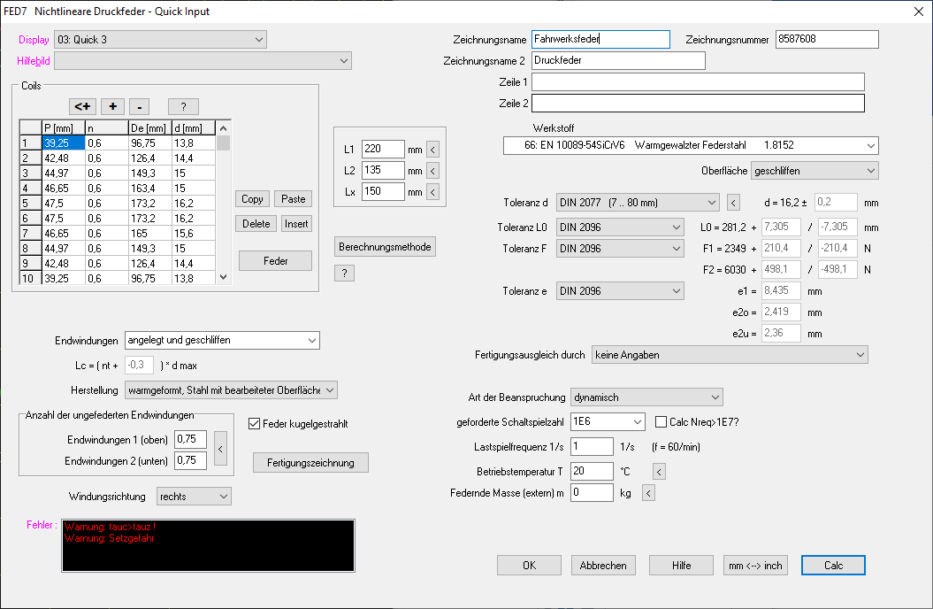 In der Quick-Eingabe wurden alle Eingabefenster in einem großen Fenster zusammengefasst. Mit "Calc" wird die Feder berechnet und die Ergebnisse im Hintergrundfenster angezeigt.