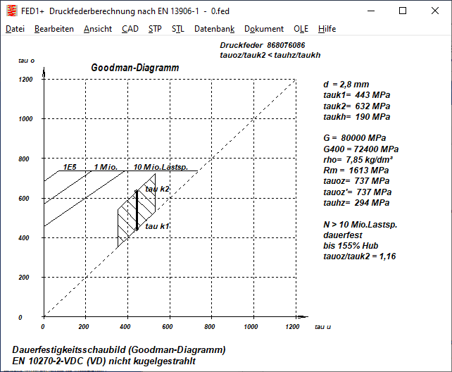 Wenn die Federkraft F1 relativ hoch ist, wird der Federhub nicht durch die maximale Hubspannung begrenzt, sondern durch die (statische) Oberspannung (Fehlermeldung tauk2 > tauz). Dass dies auch im Goodman-Diagramm zahlenmäßig erkennbar ist, wird jetzt die Sicherheit tauoz/tauk2 mit angezeigt.