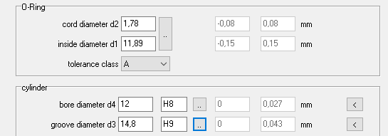 ISO tolerance fields are displayed for selection with the ".." buttons when entering tolerances. For inner seal, lower case letters were displayed for shaft tolerances instead of upper case letters for bore tolerances, this has been corrected. You can also enter the ISO tolerance field directly, DI1 then calculates the maximum and minimum dimensions.