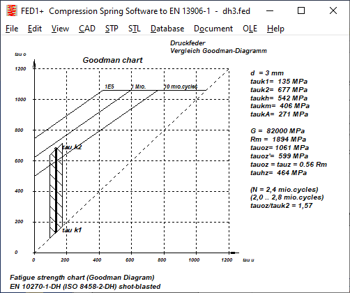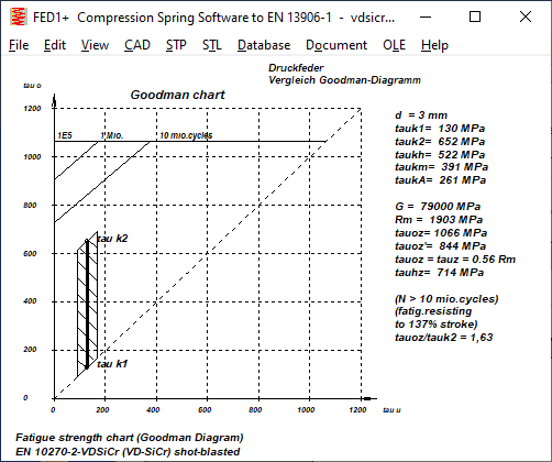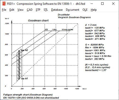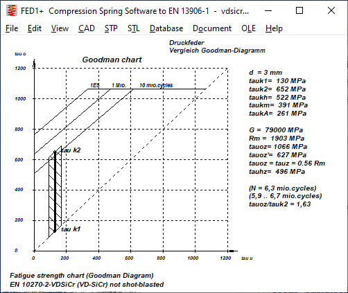 The comparison of the fatigue strength diagram for 10 million load cycles and the fatigue strength diagram for 1 million load cycles according to IGF differs significantly from the Goodman diagrams from EN 13906. While the permissible stress amplitude according to EN 13906-1 for 1E6 load cycles was approx. 25% higher than for 1E7, according to the new Goodman diagrams it is only between 10 and 15%. Conversely, for the calculation of the number of load cycles and service life, this means that these become significantly lower if the permissible fatigue variation of stress is exceeded. It is therefore planned to add a field 1E6_1E7 to the spring material database fedwst.dbf, in which the quotient tauhzul,1E6 / tauhzul,1E7 can be entered.