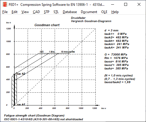 1.4310: In the case of spring steel wire 1.4310, it is not mentioned whether the type 1.4310-NS or 1.4310-HS was examined. Because the allowable shear stress (upper horizontal) in the Goodman diagram is so low, it can only be NS. For d=3mm one can read tauzul= 770 MPa. However, the permissible shear stress (tauzul=0.56Rm) at d=3mm is for ISO 6931-1-4310-NS = 868 .. 1002 MPa,