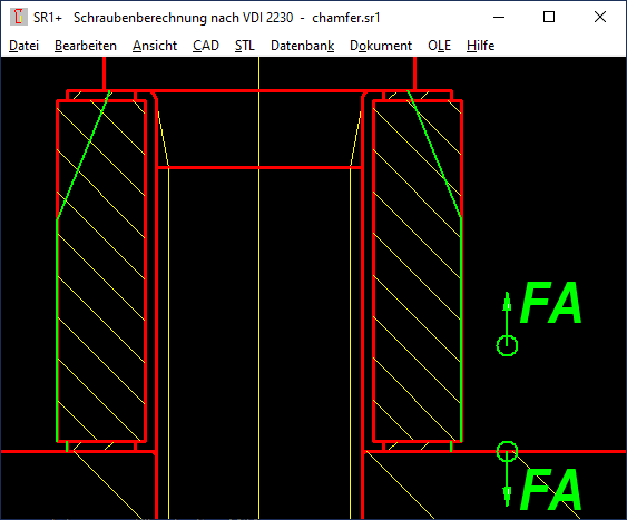 If a countersink or chamfer is to be taken into account for the calculation of surface pressure and elastic compliance, the clamp piece with countersink or chamfer is made into two cylindrical clamping plates: one with a countersink and one without. Or even three plates are created from one clamping plate if chamfers or countersinks are to be taken into account on both sides. Starting from a 45° chamfer, there is a new clamping plate with the height of the chamfer, the old clamping plate is reduced by the same height. With a 45° chamfer on the bore diameter, Di increases by 2 x chamfer height, with a 45° chamfer on the outside diameter, De decreases by 2 x chamfer height. This is now also possible automatically under "Edit\Clamping plates" "Chamfer, countersink".