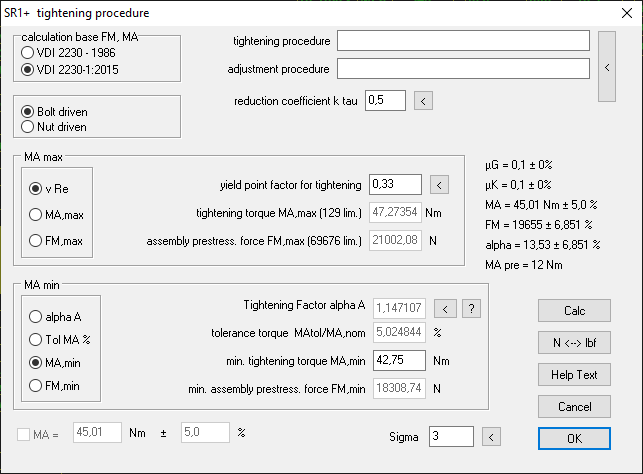 For self-locking nuts with friction torque, the yield strength factor nueRp must be entered; MA,max and MA +/- % cannot be entered here. In this case, nueRp can be changed until the desired tightening torque MA,max is displayed in the background.