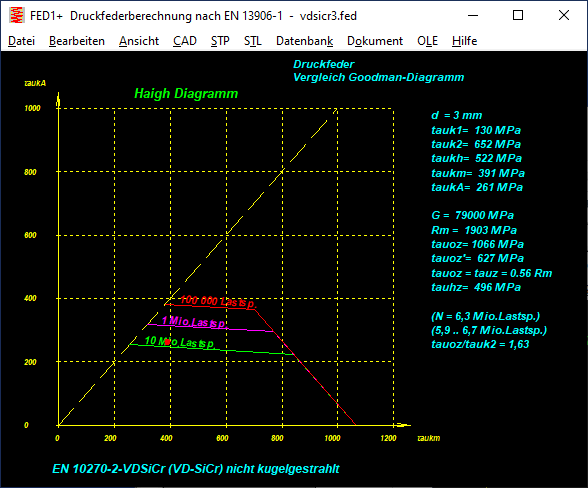 Dieses Haigh-Diagramm wird in einem Forschungsvorhaben vom Verband der deutschen Federindustrie zur Ermittlung neuer Dauerfestigkeitswerte an der TU Ilmenau verwendet, so kann man die dort verwendeten Haigh-Diagramme mit denen in HEXAGON FED vergleichen.