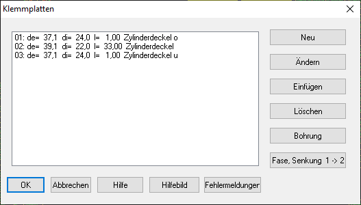 Wenn eine Senkung oder Fase für die Berechnung von Flächenpressung und elastischer Nachgiebigkeit zu berücksichtigen ist, macht man aus dem Klemmstück mit Senkung oder Fase zwei zylindrische Klemmplatten: eine mit Senkung und eine ohne. Oder aus einer Klemmplatte enstehen sogar drei, wenn beidseitig Fasen oder Senkungen berücksichtigt werden sollen. Ausgehend von einer 45° Fase, gibt es eine neue Klemmplatte mit der Höhe der Fase, die alte Klemmplatte wird um dieselbe Höhe reduziert. Bei 45°-Fase am Bohrungsdurchmesser vergrößert sich Di um 2*Fasenhöhe, bei 45°-Fase am Außendurchmesser verringert sich De um 2*Fasenhöhe. Das geht jetzt auch automatisch unter "Bearbeiten\Klemmplatten" "Fase, Senkung".