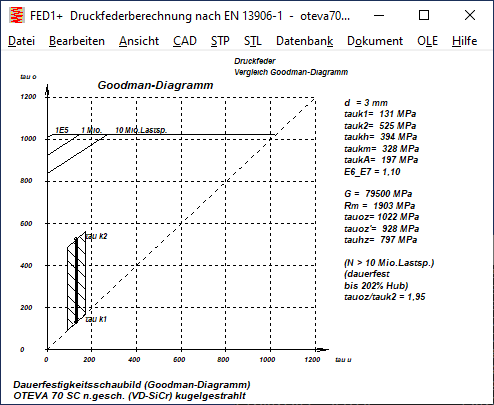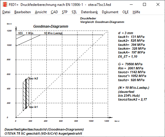 In der EN 13906-1 gibt es Goodman-Diagramme als Dauerfestigkeitsschaubilder (10 Mill. Lastspiele) und Zeitfestigkeitsschaubilder (1 Mill. Lastspiele). Ein Goodman-Diagramm als Zeitfestigkeitsschaubild gibt es für kaltgezogene Federn aus patentiert-gezogenem Federdraht der Sorte DH oder SH, kugelgestrahlt, und aus ölschlussvergütetem Draht der Sorte TD oder FD (TDC oder FDC), kugelgestrahlt, sowie für warmgeformte Federn aus warmgewalzten Stählen nach EN 10089 mit geschliffener oder geschälter Oberfläche, kugelgestrahlt. Bei diesen Zeitfestigkeitsschaubildern liegen die zulässigen Hubspannungen für 1 Million Lastspiele um ca. 25% über den zulässigen Hubspannungen für Dauerfestigkeit. Das heißt, bei einer Überlastung um 25% der zulässigen Dauerfestigkeitswert versagen die Federn nach 1 Million Lastspielen. Nun ist es gemeinhin so, dass die zulässige Überlastung geringer wird, je höher Festigkeit, Härte und Sprödigkeit. Das bestätigen auch die neuen Goodman-Diagramme aus dem IGF-Vorhaben 19693BR für 1E6 (10^6) und 1E7 (10^7) Lastwechsel. Für die individuelle Anpassung der Zeitfestigkeit erhielt die Werkstoffdatenbank fedwst.dbf ein neues Feld: E6_E7 ist der Quotient der zulässigen Schubspannung bei 1 Million (1E6) und bei 10 Millionen (1E7) Lastspielen. Nach EN 13906-1 ist dieser Faktor 1,25 für alle dort abgebildeten Zeitfestigkeitsschaubilder, das heißt die zulässige Hubspannung für 1 Million Lastspiele ist um 25% höher als für Dauerfestigkeit (>=10 Millionen Lastspiele). Bei den neuen Goodman-Diagrammen nach IGF 19693 bzw. VDFI L-001 ist dieser Zeitfestigkeitsfaktor etwas kleiner: E6_E7=1.15 für 1.4310 und 1.4568, E6_E7=1.1 für DH, VDSiCr und VDSiCrV. Wenn Sie eigene Dauerfestigkeitsdiagramme in die Datenbank einpflegen wollen, können Sie mit diesem Faktor E6_E7 den Zeitfestigkeitsbereich definieren. Der Faktor E6_E7 geht auch in die Lebensdauerberechnung ein: Wenn z.B. die Hubspannung taukh um 20% über dem Wert aus dem Dauerfestigkeitsschaubild liegt, ergibt das mit E6_E7=1.25 eine Lebensdauer zwischen 1 Million und 10 Millionen Lastspielen. Für E6_E7=1.15 beträgt die Lebensdauer weniger als 1 Million Lastspiele.