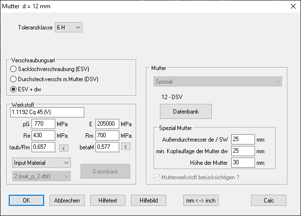 Der Werkstoff für Schraube und Mutter musste bisher aus der Datenbank gewählt werden. Jetzt kann man auch die Werkstoffdaten einzeln eingeben, ohne dafür die Datenbank erweitern zu müssen. In der Quick-Eingabe ist dafür allerdings zu wenig Platz, das geht nur unter Bearbeiten\Mutter.