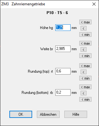 Die Maße hg, br, bh, rb, rt werden jetzt in Quick-Ansichten und Ausdruck mit Toleranzen ausgedruckt. Die Toleranzen waren zwar bisher schon berechnet und bei der Generierung des Profils berücksichtigt (min/max), aber in den Quick-Ansichten nicht angezeigt worden.