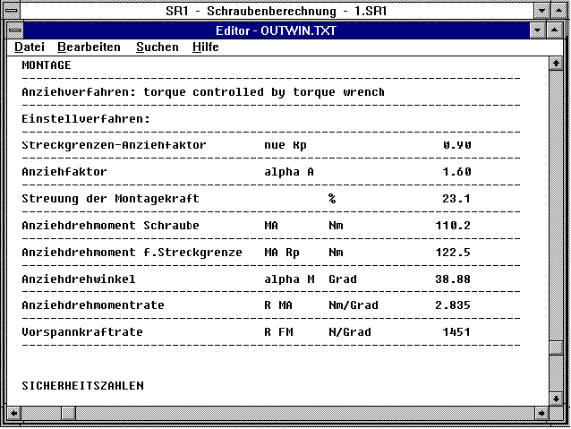 Im Ausdruck von SR1 werden außer dem Anziehdrehwinkel auch Dehnung der Schraube und Stauchung der Platten sowie die Federkonstanten angegeben.