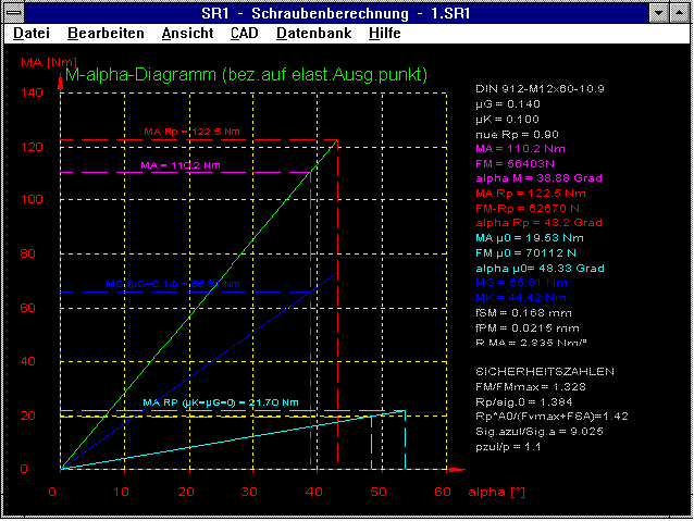 Neu im Schraubenprogramm sind ein M-alpha-Diagramm mit dem Anzugsdrehmoment über dem Drehwinkel und ein FM-alpha-Diagramm mit der Klemmkraft über dem Anziehdrehwinkel. Eingezeichnet werden auch die theoretischen Linien ohne Kopf- und Gewindereibung sowie der Anteil der Gewindereibung. Für die Anregung danke ich Herrn Shoberg von RS Technologies in Farmington Hills/USA.