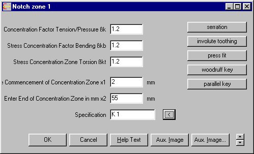 In the new NT version, it is possible to have the program enter the stress concentration factors for sliding keys, pressed fittings, notched toothing and involute toothing.