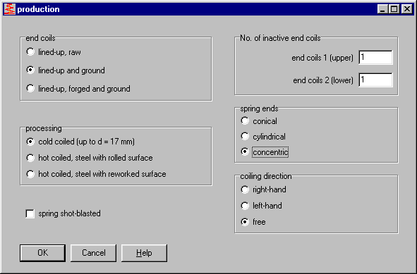 The end coils of a conical compression spring cannot be cylindrically flattened when the coils are to be flattened to wire strength (Lc=d). Even when these are flattened along the mantle line, the required effect is often not attained. Only axial flattening of the end coils (like a snail’s shell) doesn’t block the spring. The end coils are flattened on the outside at the greatest coil diameter, the end coils are flattened on the inside at the smallest coil diameter. This new feature has been added to FED5. Axial flattened end coils have no influence on the calculation of the spring forces and stress. However, the axial flattened end coils are taken into account when calculating wire length and weight of the spring. I would like to thank Mr Deeg of Stummp & Schüle, Beuren for pointing this out and lending us such a spring.