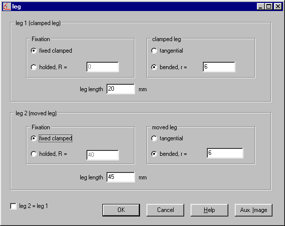 torsion springs with axial legs must be calculated as if they were torsion springs with bended legs, fixed clamped (Deflection=0). It was suggested to add this type of spring to the program. However, this is not possible, as no torsion angle delta between the legs can be calculated for this type of spring. In this case, we recommend that the number of coils is used for the calculation instead of the torsion angle. Many thanks to Mr Melchior of the Hessen Spiral Spring Factory for this suggestion.
