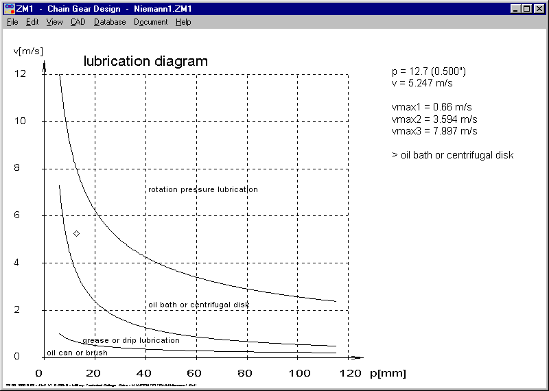 ZM1 determines the recommended type of lubrication from the diagrams for selecting type of lubrication (according to Niemann). The operation point of the calculated gear is shown in the diagram.