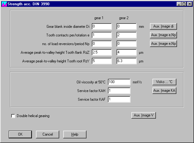 You may use different values for peak-to-valley height of flank and tooth root for gear 1 and 2. For gears with grounded tooth flanks, roughness of the (milled) tooth root is used for calculation of the safety against tooth root fracture (factor YrrelT), and the roughness of the grinded tooth flank is used for calculating tooth flank pressure (factor ZR). The average value of RzZ1 and RzZ2 is used for calculation of ZR. The factor Yrrelt may be different for gear 1 and gear 2. Thanks to Mr. van Vliet, Tech. Adviesbureau Schoonhoven/Netherland, for his improvement suggestions.