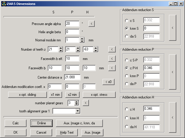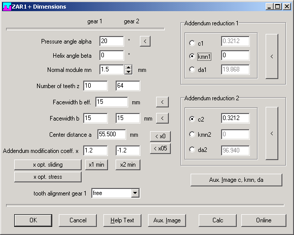 The (Standard) input of geometry of ZAR1/ZAR1+ got a new, more comfortable design. All geometry data can be edited on one dialogue window now. You have the choice to enter addendum modification coefficients x1 and x2, center distance a and x1, or a and x2. And you can define finishing of the addendum circle by entering clearance, addendum reduction (0=none), or outside diameter. By means of the "<" button, ZAR1 inserts suggestive values. At modulus input, you can click up/down for the next value according to the standards. Of course, you also can enter a module whatever you want. Or you can use the familiar old online input by a mouseclick to "Online".