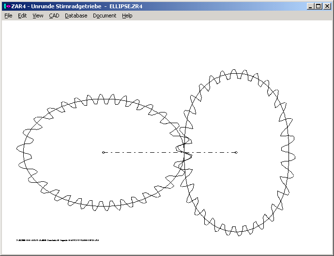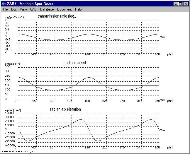 ZAR4 calculates center ditance and operating pitch curve of the driven gear. Transmission ratio, speed and acceleration are displayed at diagrams.