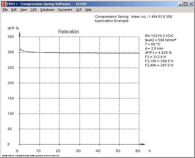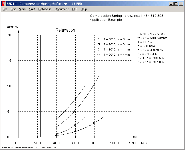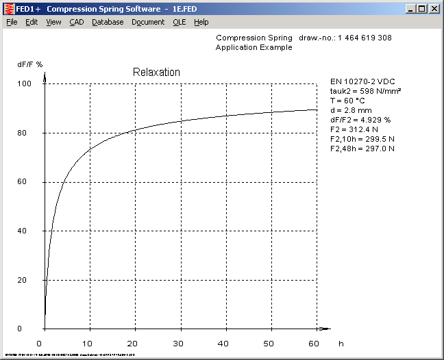 The software calculates relaxation for spring load F2 and draws diagrams of relaxation dependant from stress, temperature and wire diameter, or diagrams of relaxation rate and relexation of spring load F2 during 60 hours.