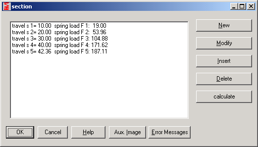 FED6 calculates a nonlinear compression spring from any progressive load curve. The procedure to use this option is as follows: Create a draft of the progressive curve you want to have for the spring. If your x-axis scales the spring length L, then add the spring travel s (s=0 starts at the intersection point with the x-axis, at F=0). Now enter the points of the spring curve at "Edit->Char.Line", then "New". After you entered all points, click into the "Calculate" button and enter coil diameter and wire diameter (0=suggest). Let L1, L2, Lx calculate by FED6 for now. Then exter spring length L0 (=Li + si). Leave block length Lc unchanged, else additional end coils will be added to the spring. FED6 now calculates the final part of the characterisr´tic spring curve, and adds a new section to the spring section array. For later re-calculations with other values, don't forget to delete the last spring section before entering new values for the spring properties.