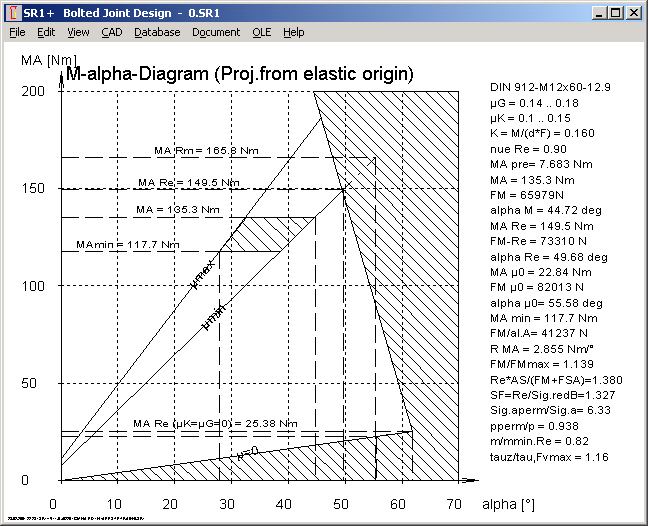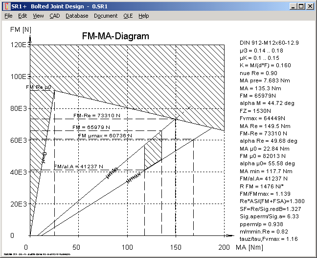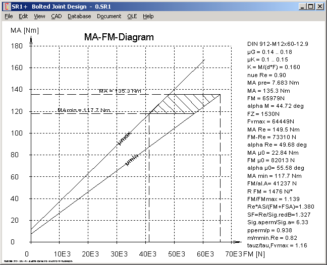A new MA-FM-Diagram is available at SR1+. Clamp load is scaled on the x-axis, with FM and FM/alphaA. The line µmin (minimum friction) crosses the tightening torque at MA (FM) and MA/alphaA (FM/alphaA). At FM/alphaA one can get the minimum torque MAmin from the intersection point with the µmax line. Tolerance zone is hatched at the diagram.