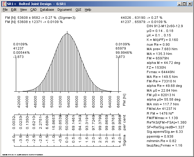Due to consideration of friction tolerances, the remaining permissible torque deviation for the tightening tool is reduced substantially. At the above example, the permissible tolerance for the tightening torque was reduced from MA - MA/alphaA= 48 Nm to MA - Mamin = 21.5 Nm. SR1+ calculates tolerances and scrap rate for statistical addition of the normal-ditributed tolerances (Gaussian bell-shape curve)