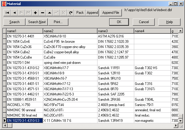 G-Module of SAF 2205 (1.4462) was changed from 73000 to 79000 N/mm², according to the new data sheet of Sandvik from September 2000. Database changes can be a problem, if the changed records have been selected in former calculations. If you load the old calculation, you get other results. If you modify database values, better use append to create a new record with the modified values, and mark at name or info fields with "old" and "new". Never delete and pack records, if you do not know if used before. If you have a network version, "Read-Only"-attribute can be set for the database directory, so that only administrators can change databases.